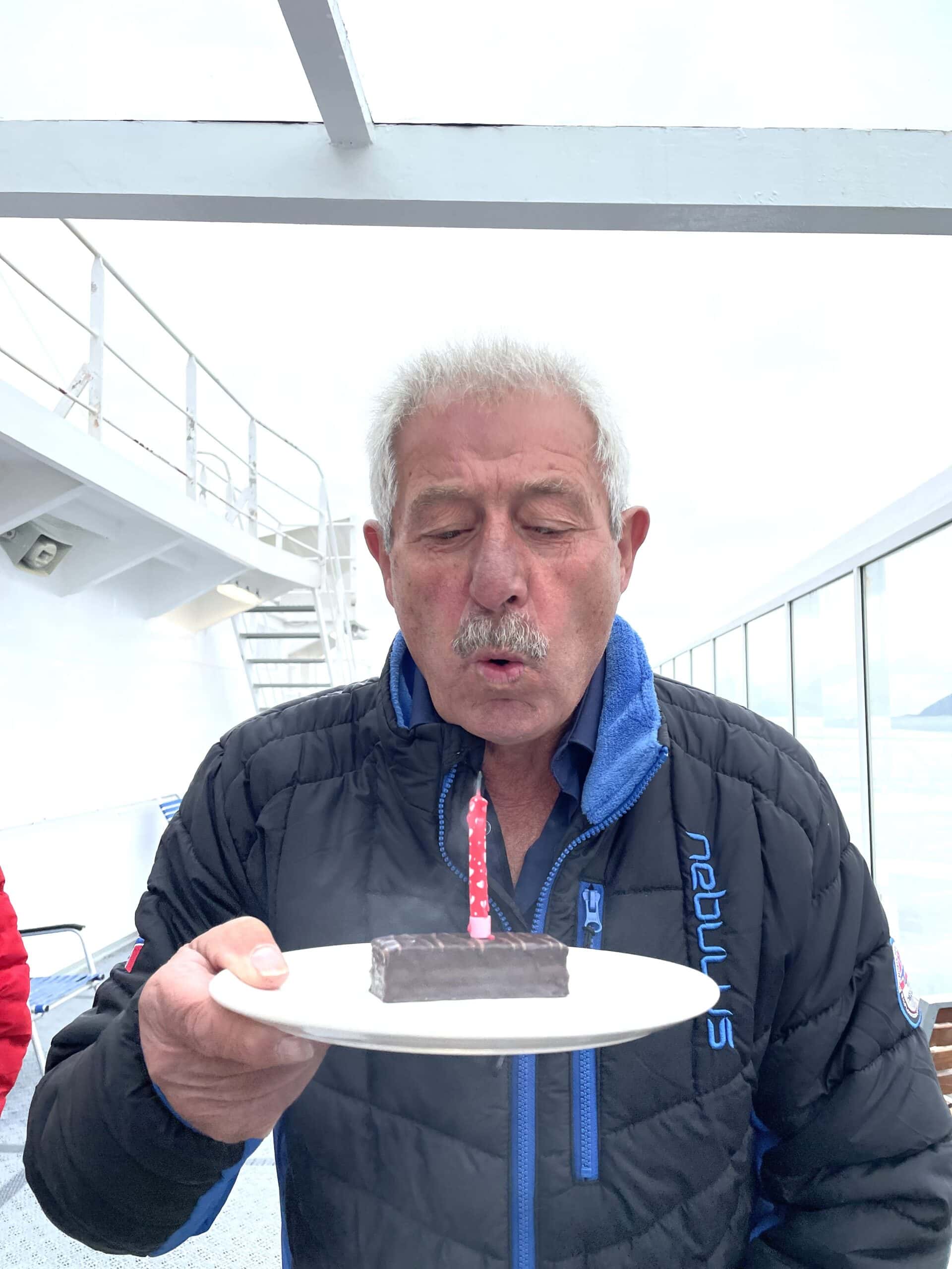 Und danach feierten wir den 70. Geburtstag unseres Geburtstagskindes, samt Luftballons, Kuchen und Kerze. Im Anschluss folgte die Polartaufe, welche so mache Mutige mitmachten und natürlich unser Geburtstagskind ebenso.